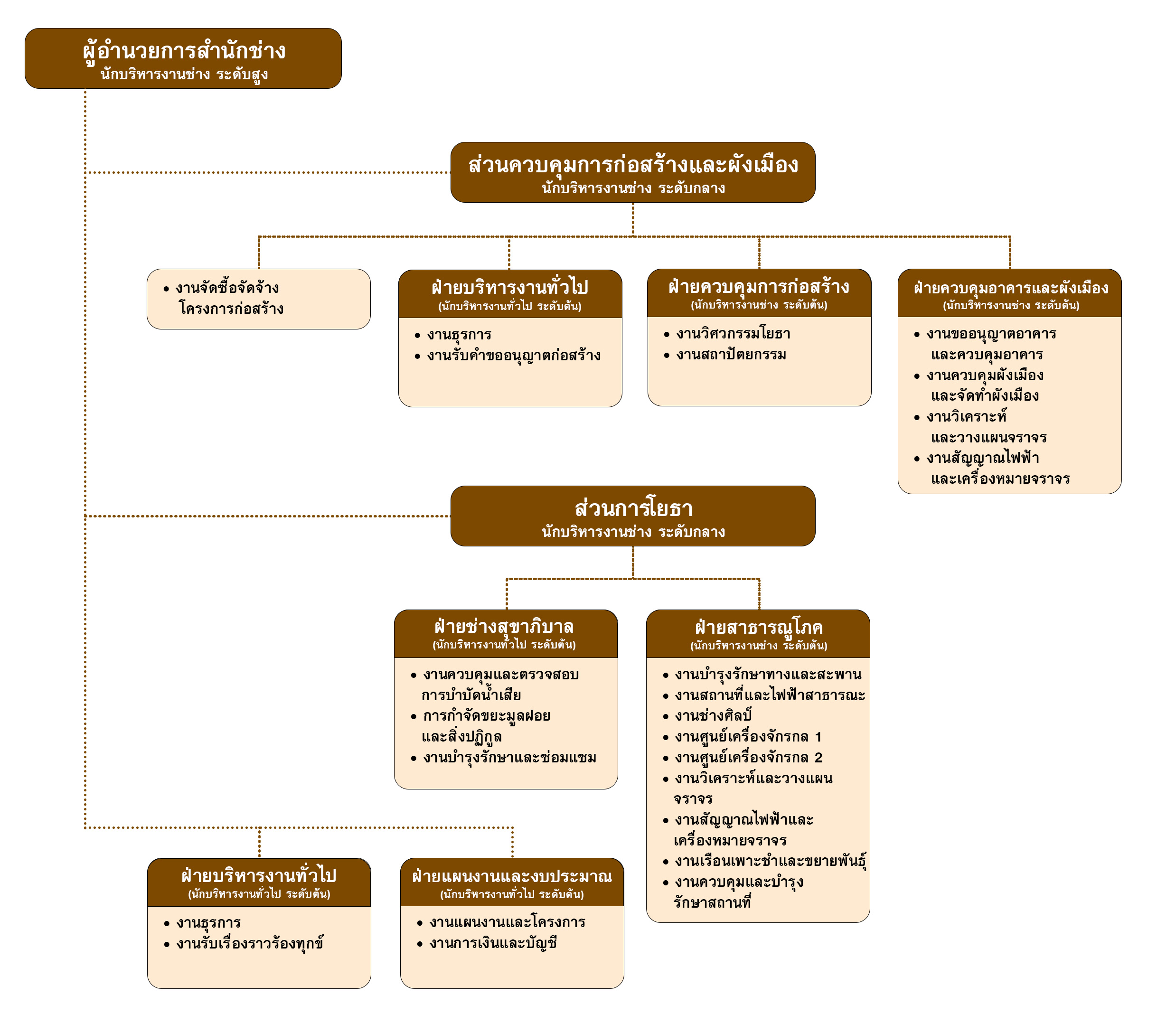 สำนักช่าง (05) มีหน้าที่ความรับผิดชอบเกี่ยวกับ งานสำรวจ งานออกแบบและเขียนแบบ งานประมาณราคากลาง งานจัดทำข้อมูลทางด้านวิศวกรรมต่างๆ งานจัดเก็บและทดสอบคุณภาพวัสดุ งานจัดทำทะเบียนประวัติโครงสร้างพื้นฐาน อาคาร สะพาน คลอง แหล่งน้ำ งานติดตั้งซ่อมบำรุงระบบไฟส่องสว่างและไฟสัญญาณจราจร งานปรับปรุงภูมิทัศน์ งานผังเมืองตามพระราชบัญญัติการผังเมือง งานการควบคุมอาคาร ตามระเบียบกฎหมาย งานตรวจสอบการก่อสร้าง งานจัดทำแผนปฏิบัติงานการก่อสร้างและซ่อมบำรุงประจำปี งานควบคุมการก่อสร้างและซ่อมบำรุง งานจัดทำประวัติ ติดตาม ควบคุมการปฏิบัติงานเครื่องจักรกล งานจัดทำทะเบียนประวัติการใช้เครื่องจักรกลและยานพาหนะ งานแผนการบำรุงรักษาเครื่องจักรกลและยานพาหนะ งานเกี่ยวกับการประปา งานเกี่ยวกับการช่างสุขาภิบาล งานช่วยเหลือสนับสนุนเครื่องจักรกล งานช่วยเหลือสนับสนุนการป้องกันและบรรเทาสาธารณภัย งานช่วยเหลือสนับสนุนด้านทรัพยากรธรรมชาติและสิ่งแวดล้อม งานจัดทำทะเบียนควบคุมการจัดซื้อ เก็บรักษา การเบิกจ่ายวัสดุ อุปกรณ์ อะไหล่ น้ำมันเชื้อเพลิง งานบริการข้อมูล สถิติช่วยเหลือให้คำแนะนำทางวิชาการด้านวิศวกรรมต่างๆ งานอื่นๆ ที่เกี่ยวข้องและที่ได้รับมอบหมาย โดยมีผู้อำนวยการสำนัก ระดับสูง เป็นผู้ควบคุมดูแลและแบ่งหน่วยงานภายในส่วนราชการออกเป็น 2 ส่วน 8 ฝ่าย 26 งาน ดังนี้